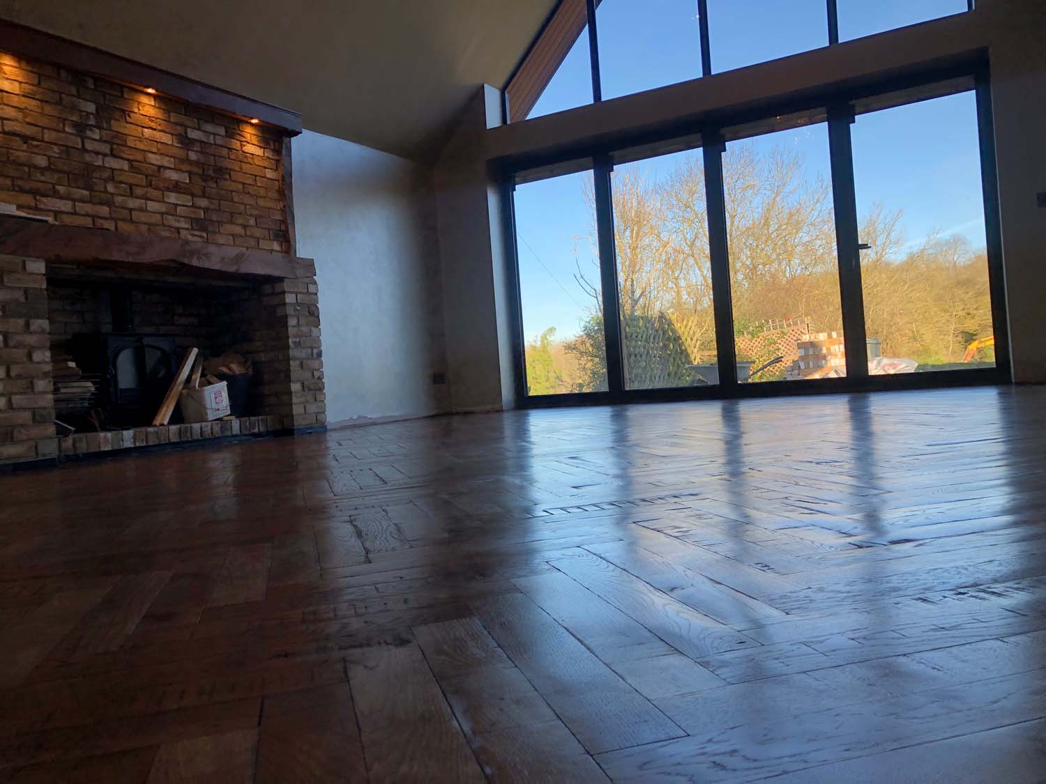 Installation of reclaimed oversized oak parquet laid in the herringbone pattern. Hand sanded to retain the timbers natural patina and character, finished with a oil stain and sealed with a clear hardwearing lacquer.